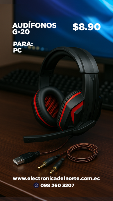 🎧 Audífonos G-20 con micrófono, ideales para PC. Sonido envolvente, micrófono flexible y diseño cómodo para largas sesiones de uso.