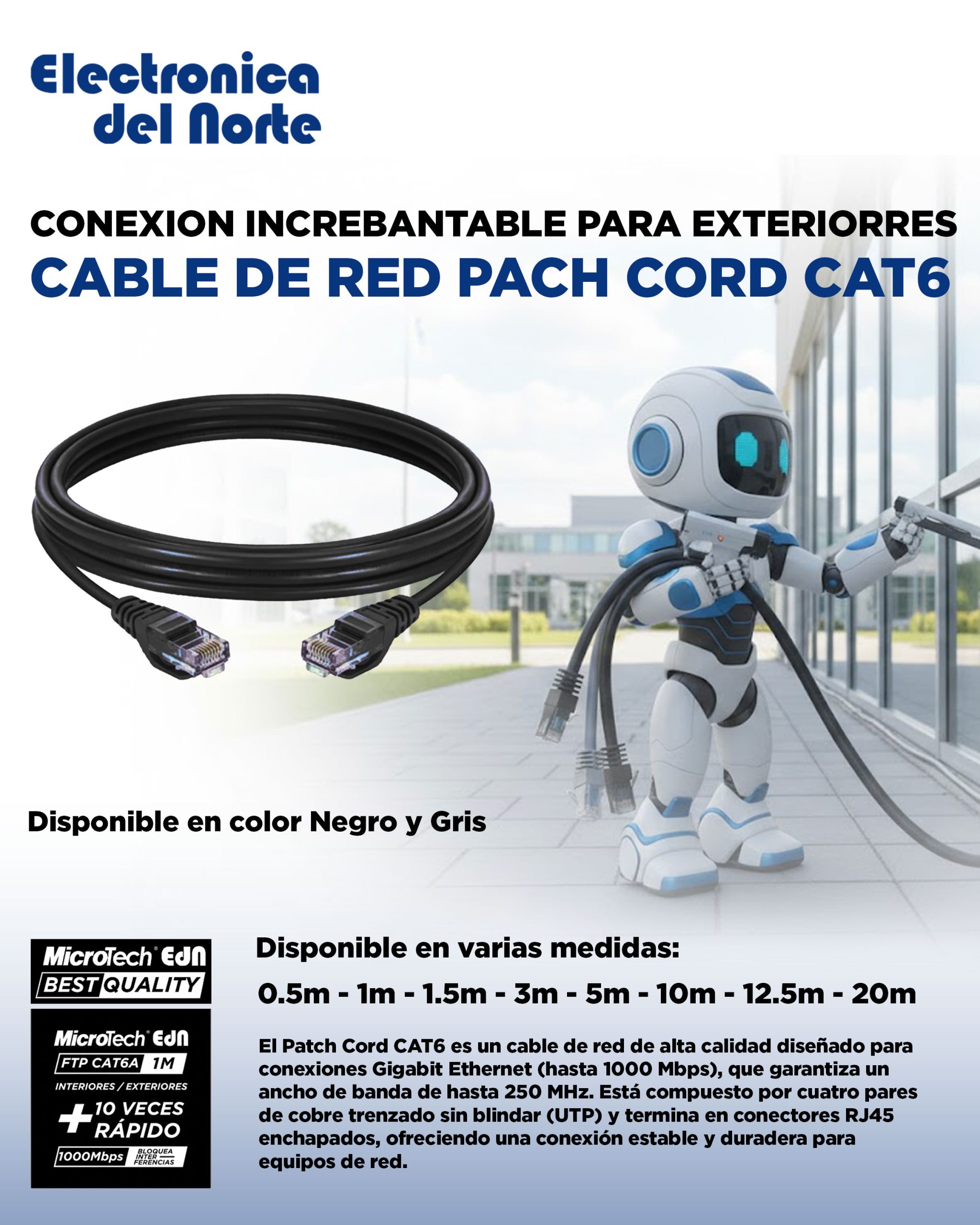 Cable de red Patch Cord CAT6 estándar para conexiones Gigabit Ethernet (1 Gbps) y 10G a cortas distancias. Opera a 250 MHz con conectores RJ45, ideal para conectar PCs, switches y routers en redes de alta velocidad.